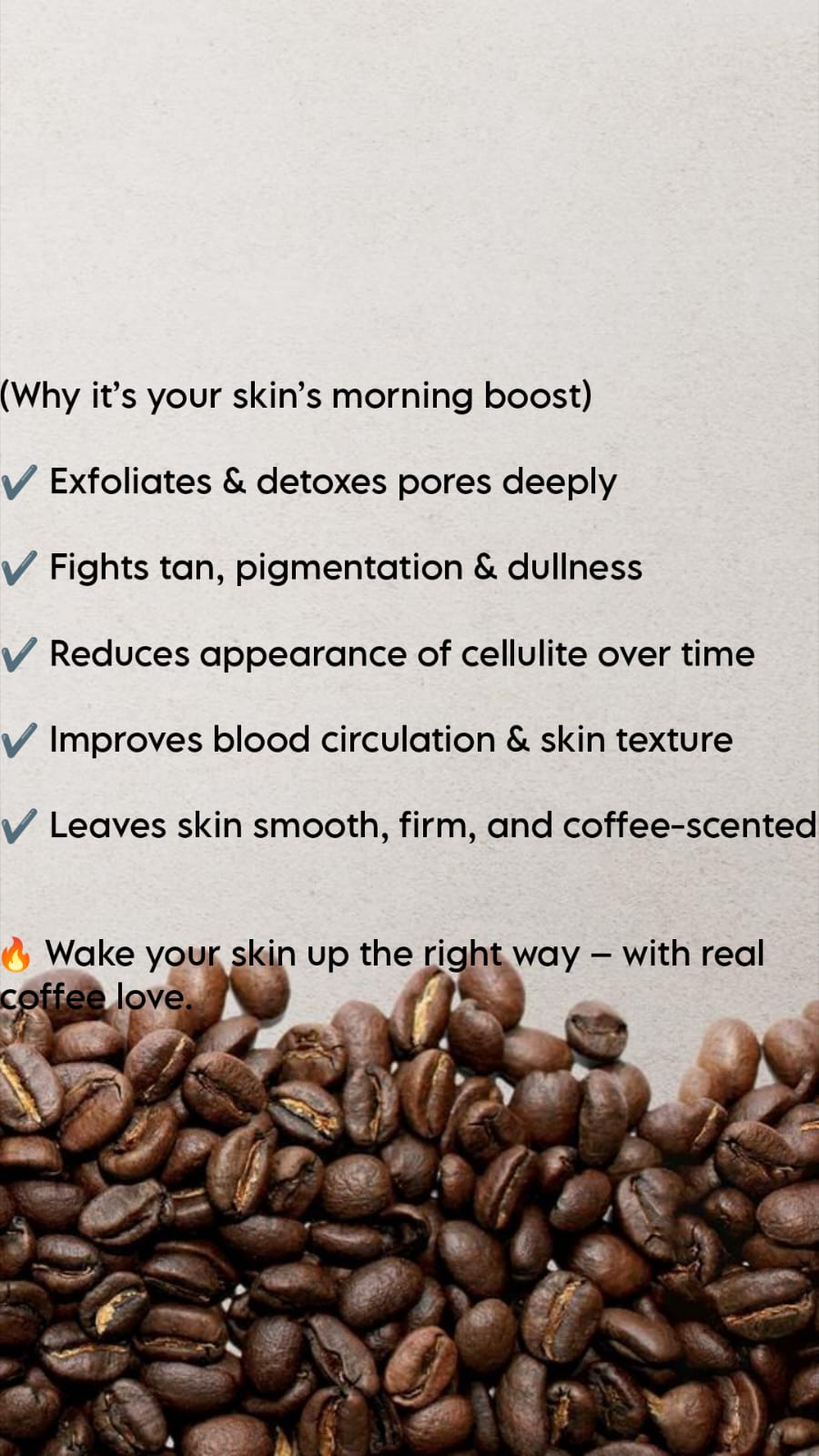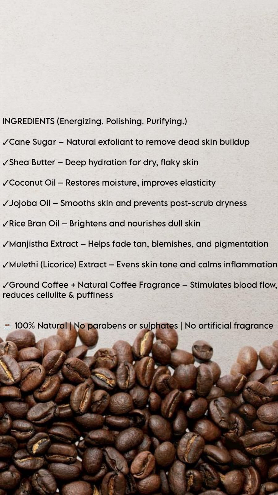 Revive tired, dull skin with our Coffee Glow Body Scrub, a handmade blend of Ayurvedic actives, rich butters, and stimulating coffee essential oil. Designed to exfoliate deeply, reduce pigmentation and cellulite visibility, and awaken your skin’s natural vibrance.