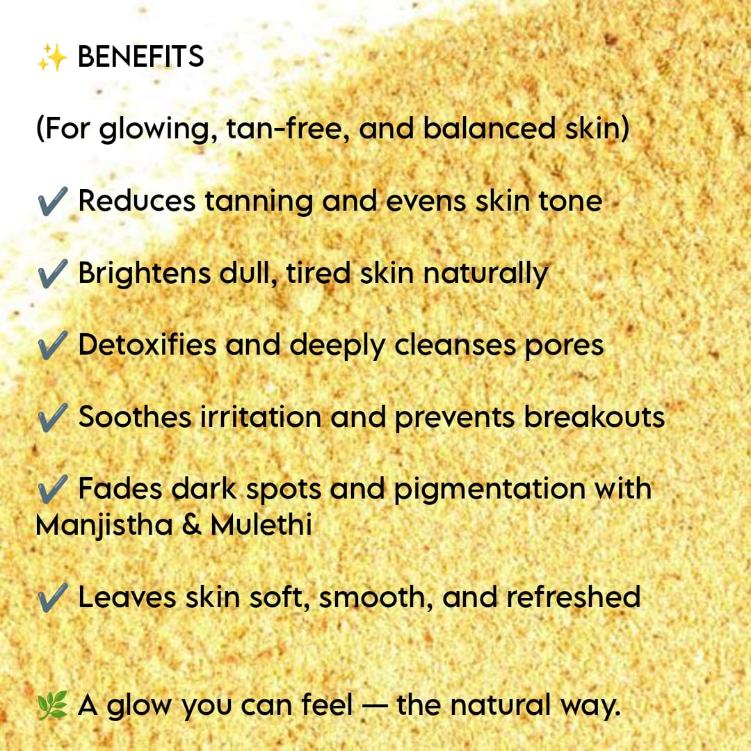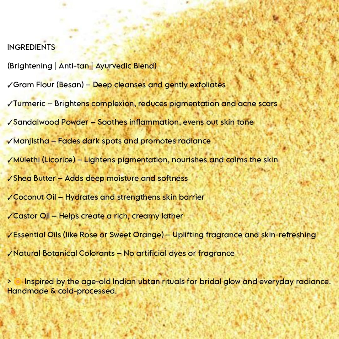Ubtan Blend (Turmeric, Gram Flour, etc.): Traditionally used to brighten and even skin tone.
