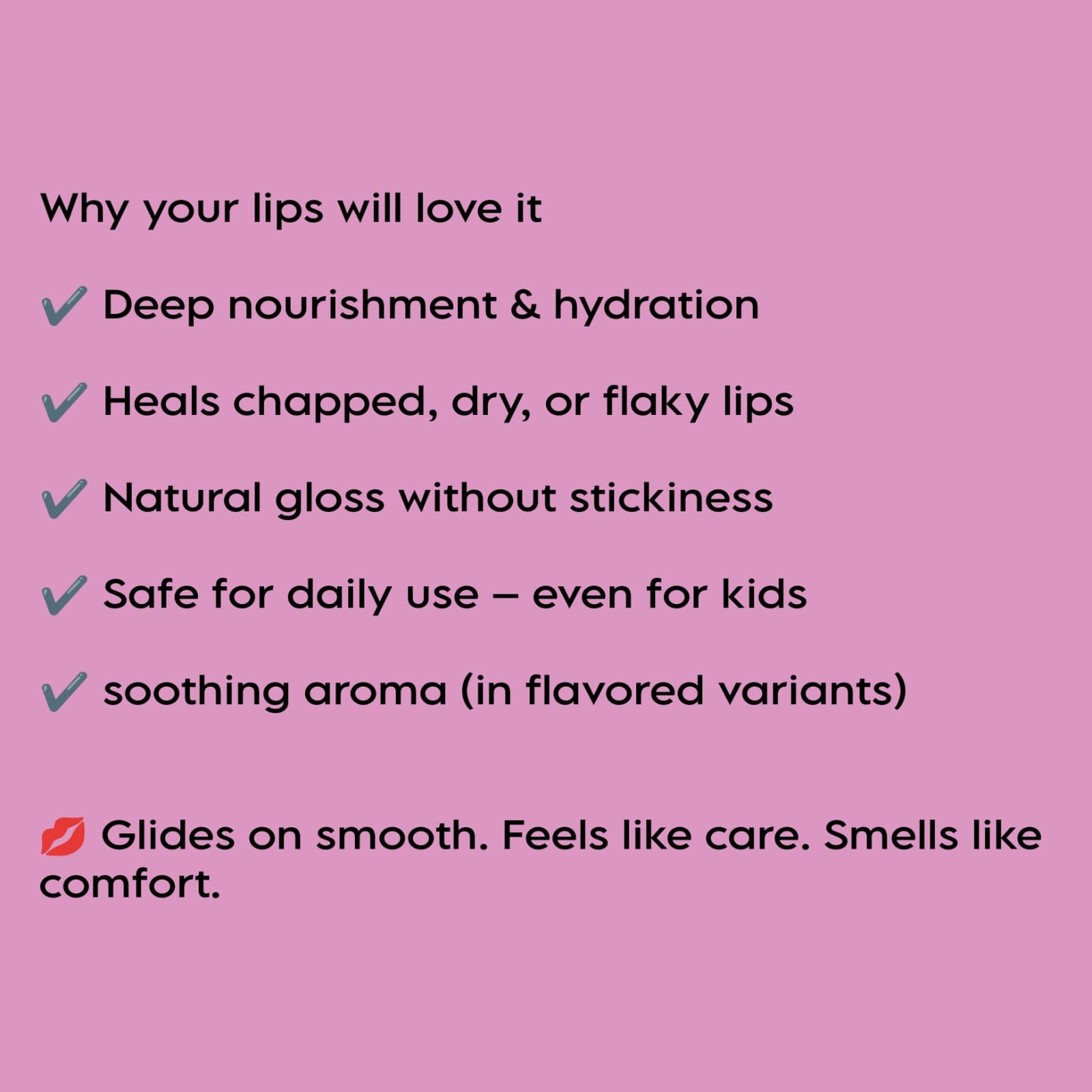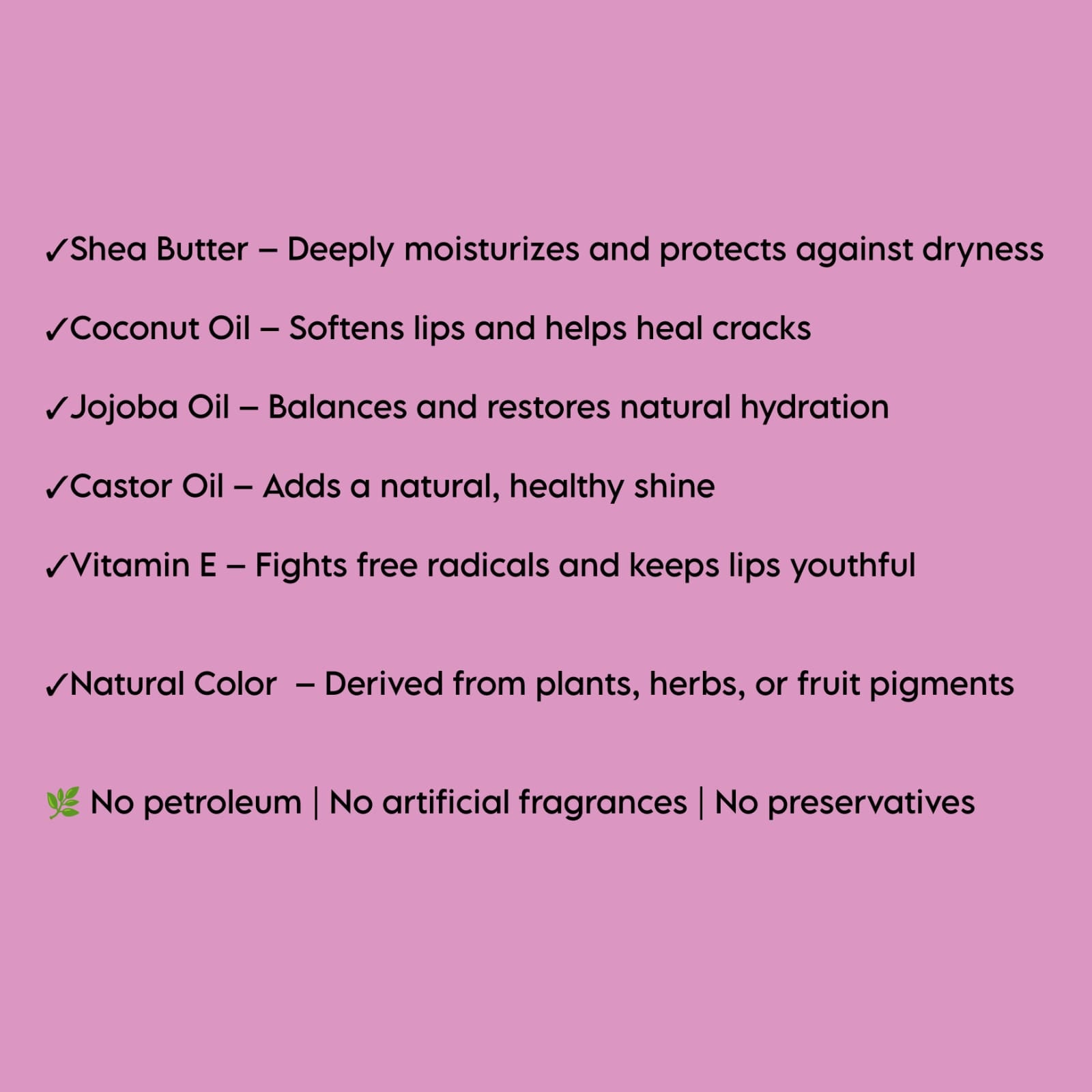 - Raw Shea Butter, Kokum Butter & Cocoa Butter – Deeply moisturize and repair chapped lips