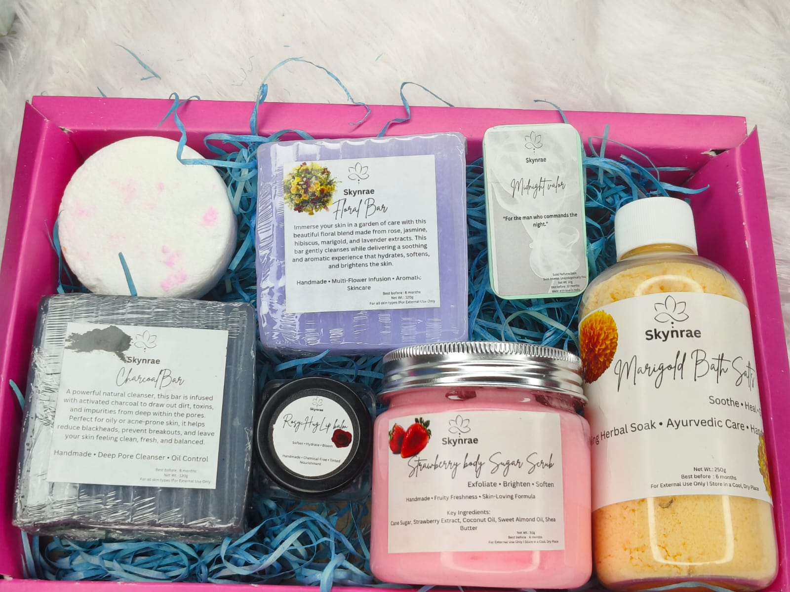 Choose your favorite scents, blends, and color themes to match your personality or the occasion. Whether you want a floral escape, a citrus refresh, or a herbal detox, Skynrae crafts every box to perfection.